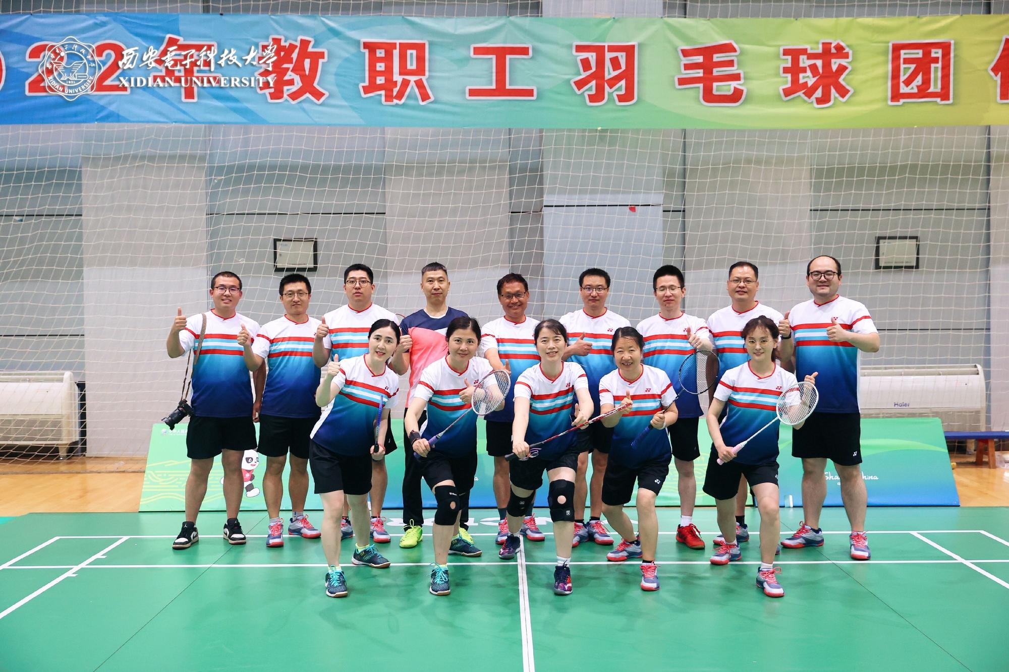 新学院成立,学院运动员选拔基数大大减少,但新队伍依然继承并继续发扬学院不畏向前、敢于拼搏,勇于胜利的优良传统,在小组赛阶段对阵微电子学院一队、物理学院二队,经过一天的顽强拼搏成功晋级淘汰赛。在淘汰赛阶段对阵传统强队通信工程学院一队,队员们依然全力以赴,经过数场鏖战后,不敌对手遗憾落败,最终荣获2022年教职工羽毛球团体赛优秀奖。