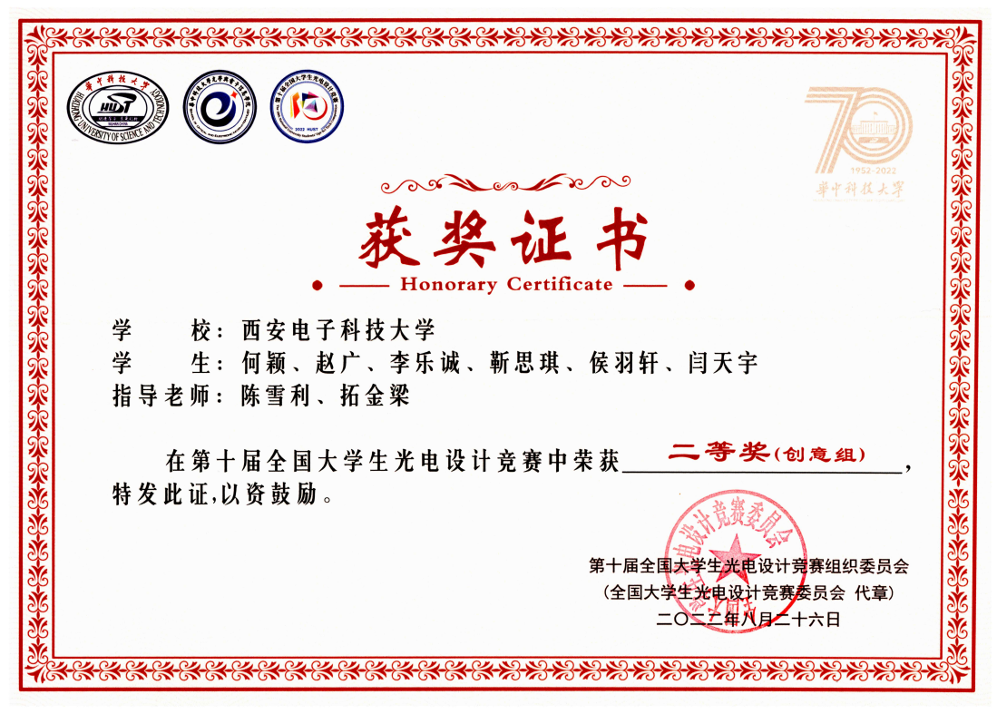 (通讯员:解培月 吕强)第十届全国大学生光电设计竞赛决赛于2022年8月26日在华中科技大学以线上创新赛形式圆满落幕,经过西北区赛和全国决赛阶段的激烈角逐,西安电子科技大学代表队获得2项国家二等奖、11项西北区赛奖的好成绩。