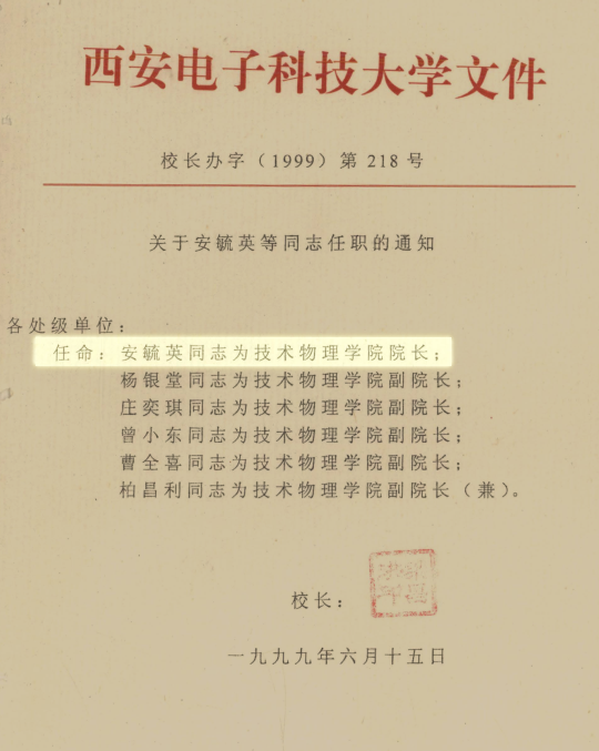 1999年安毓英任职为技术物理学院院长的通知(西电档案馆馆藏)