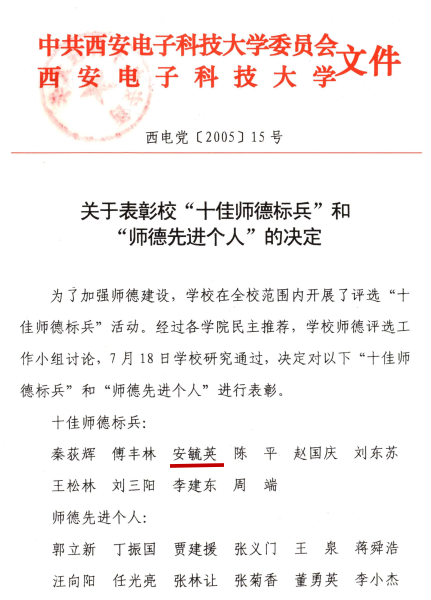 2005年安毓英教授被评为“十佳师德标兵”(西电档案馆馆藏)