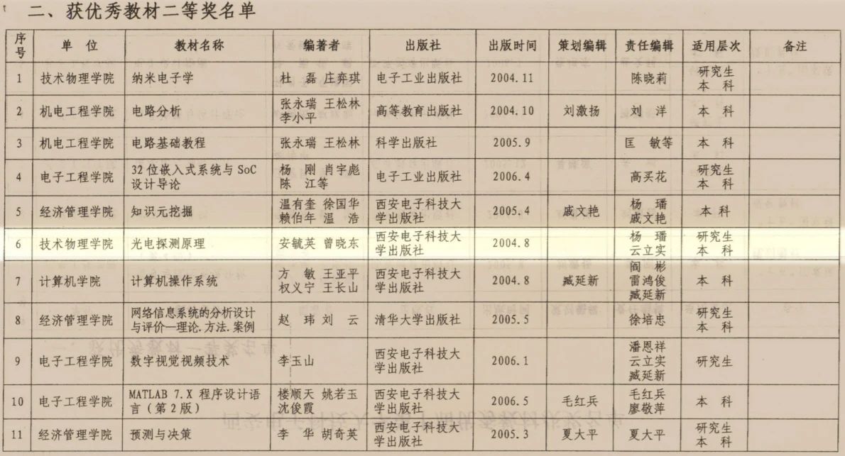 《光电探测原理》获西安电子科技大学第十届优秀教材二等奖(西电档案馆馆藏)