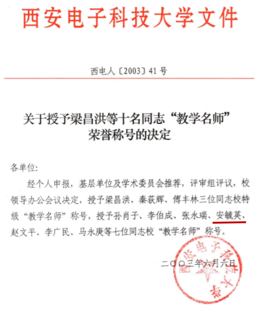 安毓英教授被授予校“教学名师” 称号(西电档案馆馆藏)
