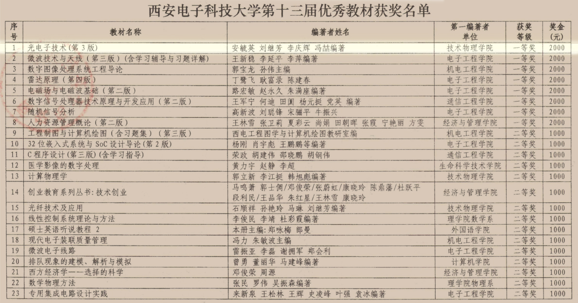 《光电子技术》(第3版)获西安电子科技大学第十三届优秀教材一等奖(西电档案馆馆藏)