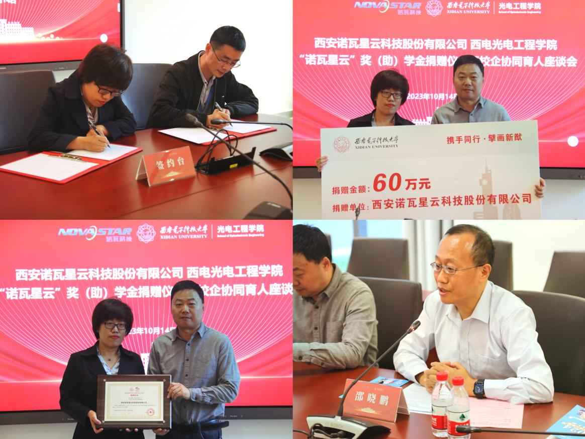 (通讯员:李佳铭,供图:张思齐、隋皓宇)为支持学院教育事业发展,助力人才培养与科技创新,恰逢学校建校92周年暨第五届校友日,西安诺瓦星云科技股份有限公司向学院捐赠60万元用于设立“诺瓦星云”奖助学金项目,以激发光电学子学习热情,帮助学生走好求学之路,全力追求梦想。10月14日,捐赠签约仪式在南校区会议中心113会议室顺利举行,西安诺瓦星云科技股份有限公司人力副总裁赵星梅、人力资源经理卫玮、校园招聘经理王召锐、西电校友事务与对外合作处副处长蒋昙飞、学院党委书记独国社、院长邵晓鹏、正处级组织员郑晓东、副院长秦翰林参加捐赠签约仪式。仪式由党委副书记李洁主持。
