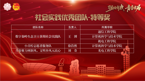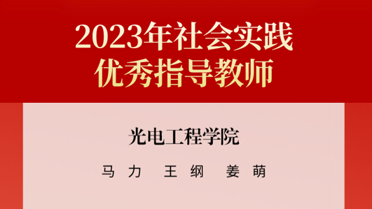 获2023年大学生暑期“三下乡”社会实践活动优秀组织单位,王纲、姜萌、马力三位老师获评学校优秀实践指导教师,“青春聚力树新风,文明乡风入民心”暑期社会实践队获特等奖,“感悟时代发展成就,逐梦光电创想未来”暑期社会实践队获二等奖,两支队伍受邀参加“如何发挥专业特色助力乡村振兴建设”、“在社会实践中凝练国之大者的人生目标”主题分论坛,并做分享。