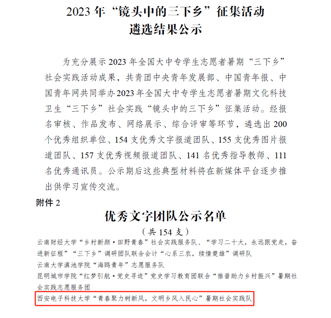 (通讯员:马力 高惠)近日,由共青团中央青年发展部、中国青年报、中国青年网共同举办的2023年全国大中专学生志愿者暑期文化科技卫生“三下乡”社会实践“镜头中的三下乡”征集活动遴选结果公布,经报名审核、作品发布、网络展示、综合评审等环节,WG体育
