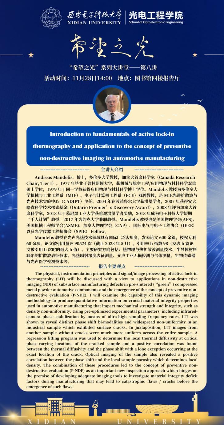 (通讯员:马世奇 李植源 张思齐)为激发学生学习兴趣,帮助学生探知前沿知识,提高学生学习专业知识的积极性,引导学生做好学业生涯规划,11月28日下午,“希望之光”大讲堂第八讲在南校区图书馆四楼报告厅精彩开启,本次活动邀请到了加拿大多伦多大学教授、加拿大皇家科学院院士Andreas Mandelis担任主讲嘉宾,WG体育