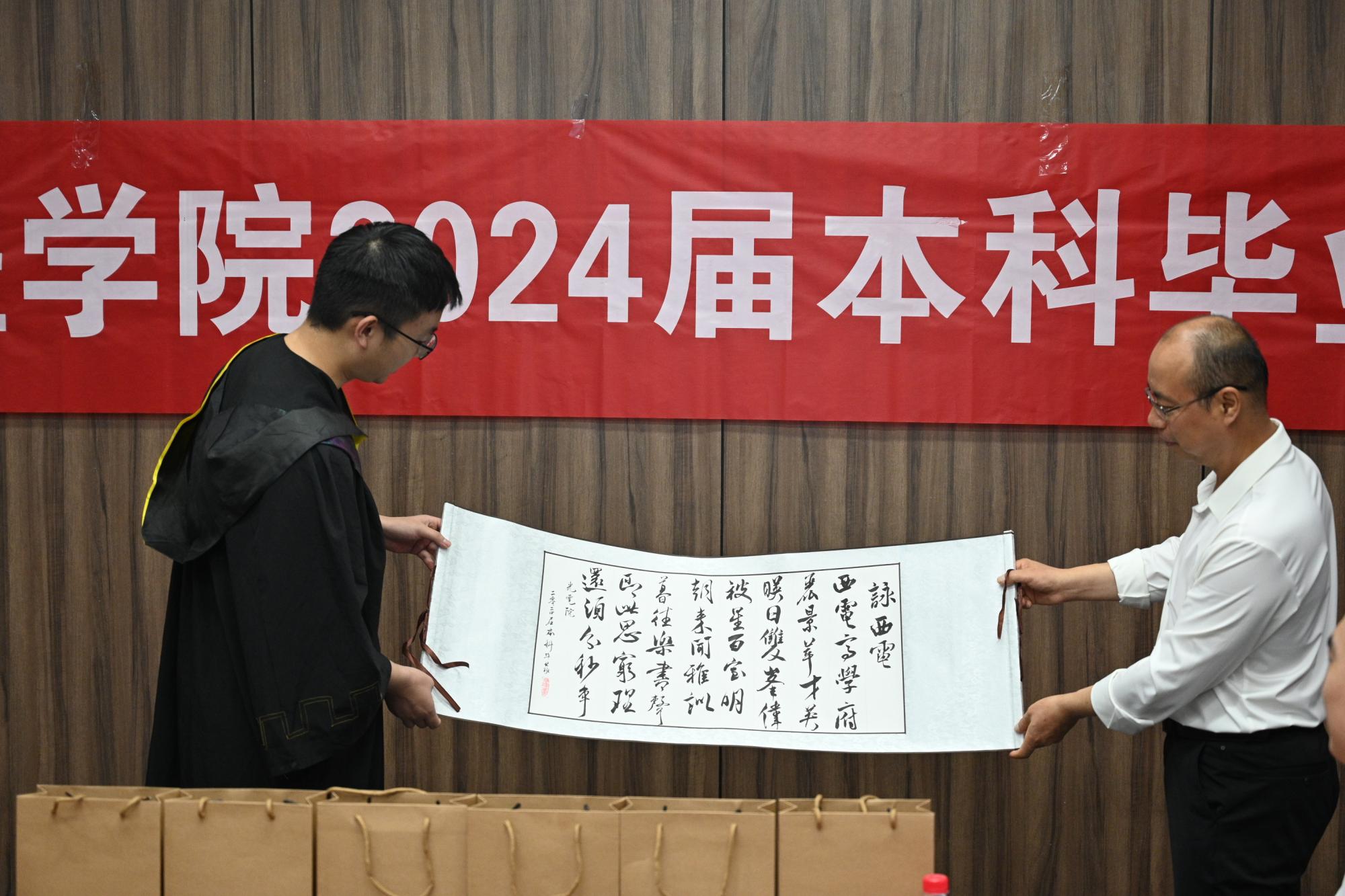 会上,周张翼代表全体毕业生向学院赠送了书法作品《咏西电》,以此表达学子们对于母校培养的感激之情。黄小强和杨威代表学院为毕业生赠送毕业礼物。
