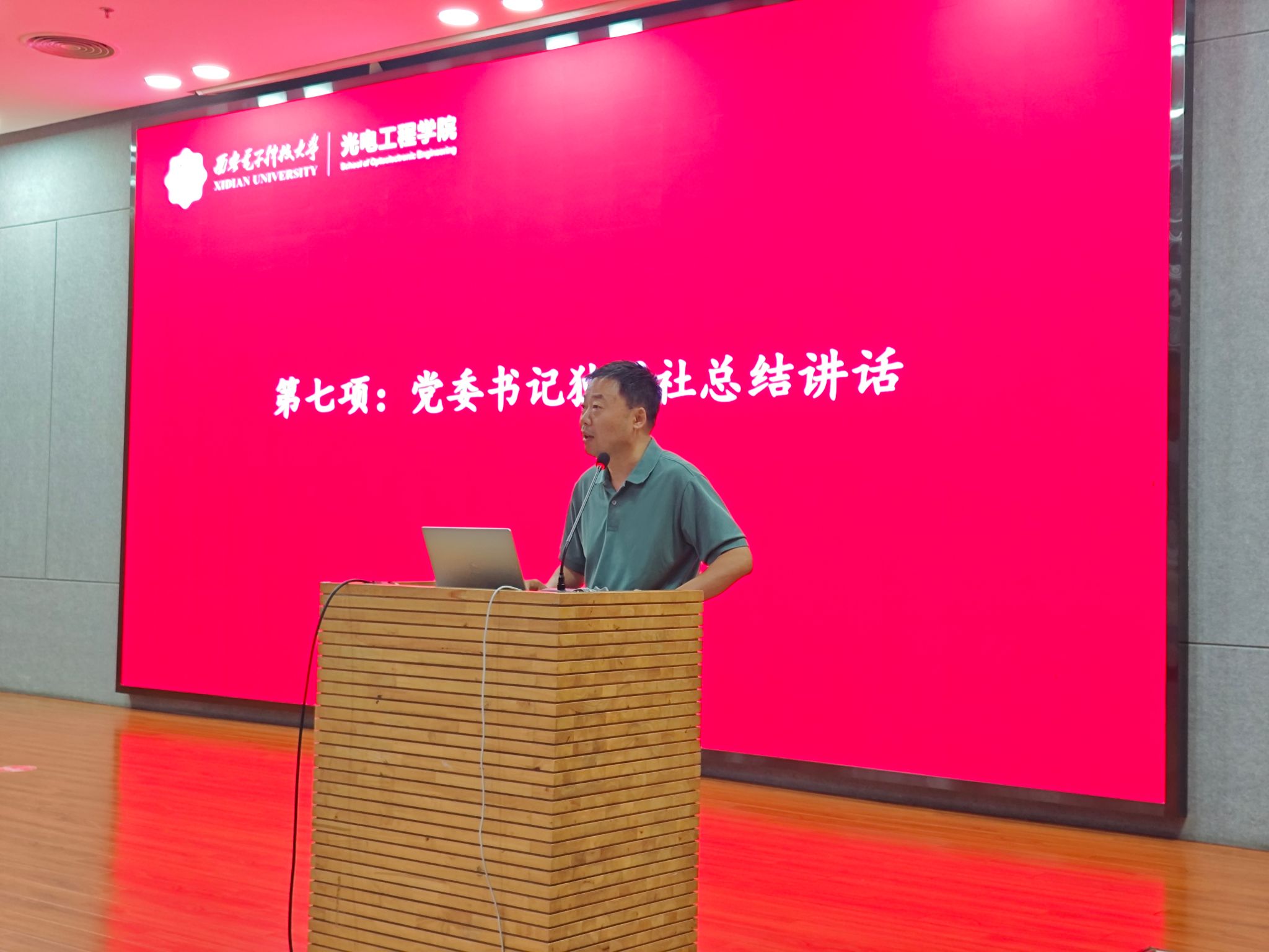 最后,独国社书记作总结讲话。他勉励同学们:一是要厚植家国情怀,注重品格塑造,树立起服务国家、奉献社会的远大志向,以青春之力扛起新时代西电光电人的使命担当。二是要夯实学业根基,锤炼过硬本领,珍惜时光、勤奋钻研,秉持“学在西电”严谨治学、求真务实的优良学风,赓续西电人踏实刻苦、追求卓越的优良传统,努力成为栋梁之才。三是坚持身心共育,拥抱健康生活,希望同学们主动参与体育锻炼和集体活动,在运动中增强体质、磨炼意志、培养团队精神;同时也要关注心理健康,掌握压力管理技巧,保持乐观向上的心态。
