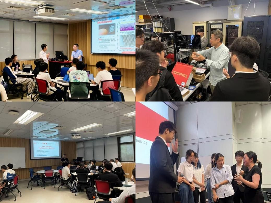 香港理工大学访学期间,光电学子聚焦光电前沿技术领域的热门方向,先后与吕超教授、余长源教授、赖博洋教授、黄冬梅教授等教授学者进行学术交流。在香港理工大学-华为网络光互连与先进计算联合系统实验室,访学团近距离接触光互连技术研发设备,直观感受产学研融合的创新活力,围绕“光通信链路优化”“算力网络协同”等专业问题与吕超教授深入探讨。在授课环节,余长源教授重点讲解了光纤通信、光纤传感及光电成像三大系统的技术突破、技术落地路径。赖溥祥教授围绕光电成像技术在生物医学领域的应用较为系统地梳理了当前技术发展现状。黄冬梅教授系统介绍非线性光学、集成光子学的研究进展。在课后交流中,同学们围绕人工智能在生物医学领域应用、扫频激光器的技术细节与应用场景等话题积极展开讨论、提问、互动。