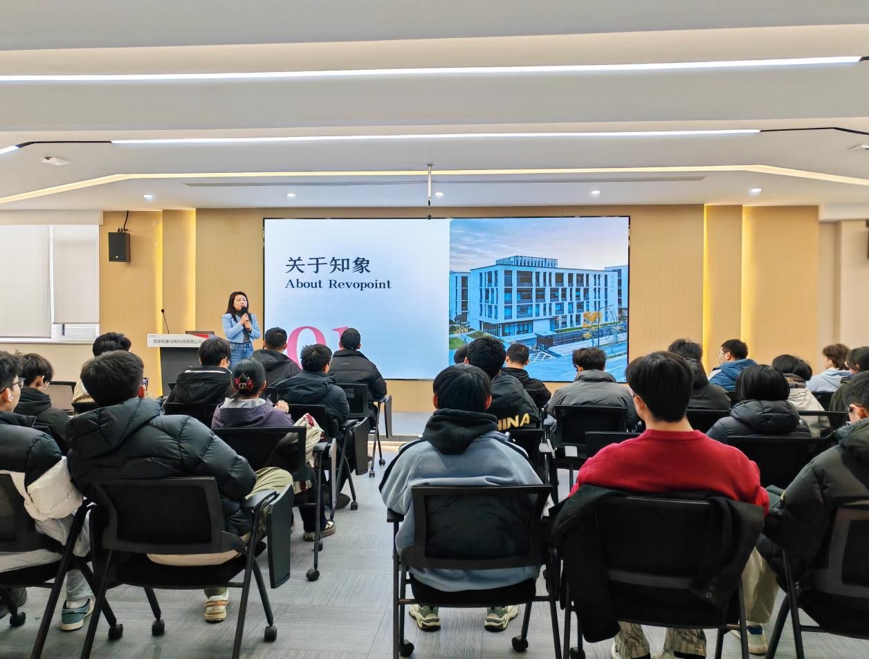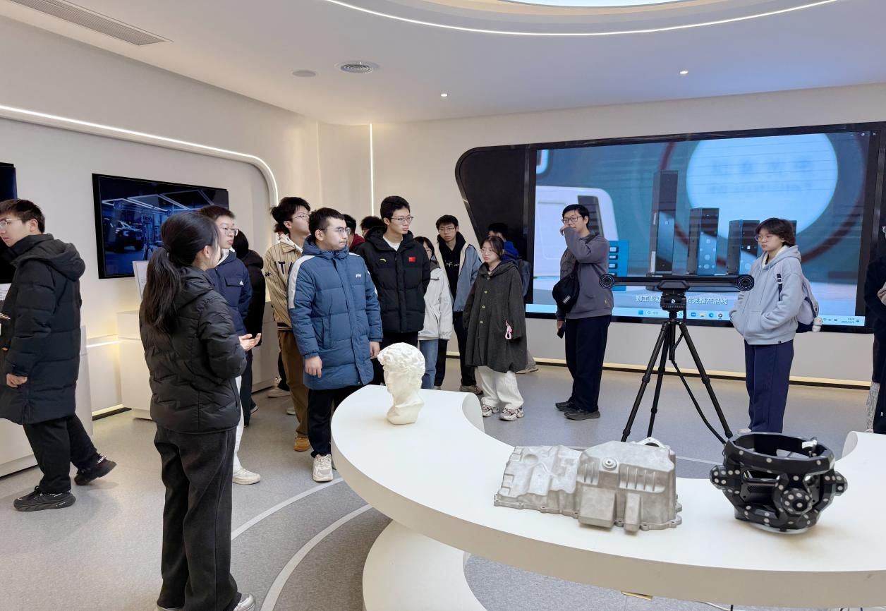 同学们首先参观了企业展厅。通过详细的介绍,大家了解了知象光电是一家专注于高精度三维视觉与具身智能技术的国家级专精特新重点“小巨人”企业。公司产品广泛应用于工业三维扫描、机器人视觉、无人机航拍等场景,用户覆盖三维设计、工业检测、3D 打印、医疗健康、数字娱乐、创意艺术、文物保护等多个领域。