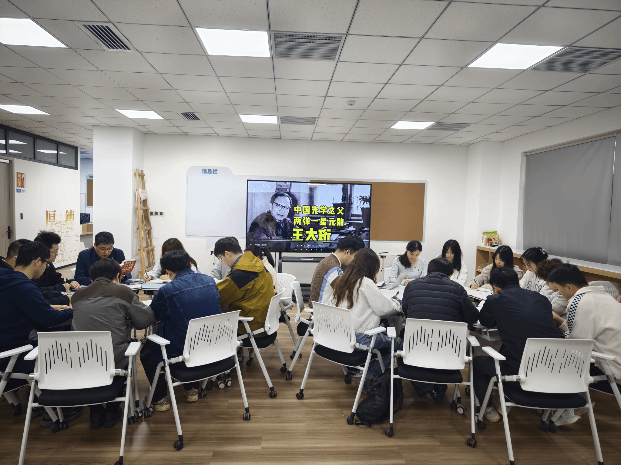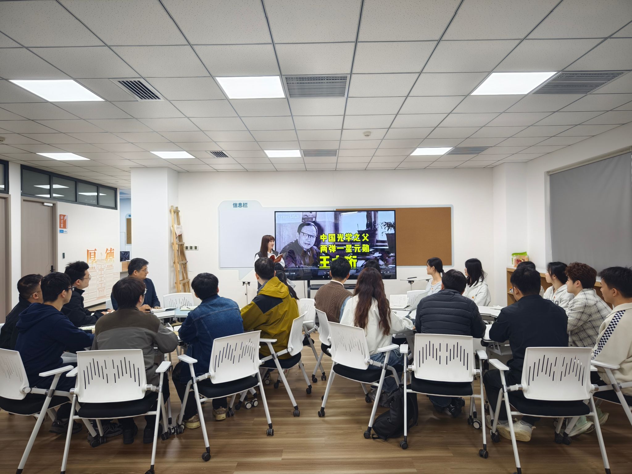 本次活动紧扣专业特色,师生共读《记忆里的两弹一星》,由党支部书记刘飞老师领学重点章节,他以书中王大珩院士等光电领域元勋的科研历程为切入点,结合光学工程学科的发展脉络,用实例阐述了“热爱祖国、无私奉献,自力更生、艰苦奋斗,大力协同、勇于登攀”的“两弹一星”精神内涵,勉励同学们以王大珩院士为榜样,将个人所学融入国家发展大局,在光电领域接续奋斗。随后,师生党员共同观看了纪录片《中国光学之父、两弹一星元勋—王大珩》。影像中,王大珩院士从放弃国外优厚待遇毅然归国,到白手起家创办中国科学院仪器馆、奠定新中国光学事业基础,再到为“两弹一星”工程研制大型光学观测设备呕心沥血的事迹,深深触动了在场的每一位光电学子。