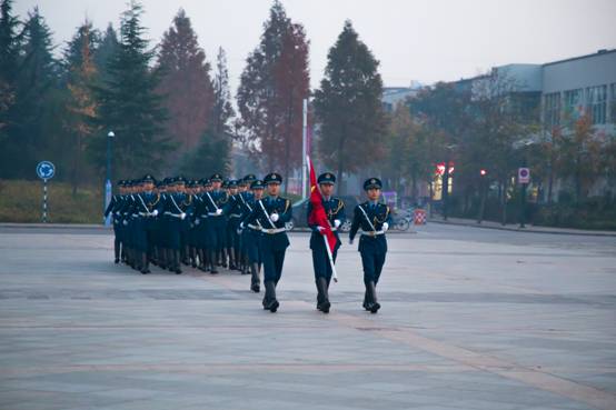 早晨6点30分左右,学院17级新生在规划好的场地上列队完毕,立正站好。7时整,国防生们迎着朝阳,踏着矫健的步伐,庄严地护卫五星红旗进场。随后,旗手则在国旗杆前手执五星红旗一角肃立,雄壮豪迈的《义勇军进行曲》响彻整个礼仪广场,老师和同学们行注目礼,国防生们行军礼,全场弥漫着庄严肃穆的气息。