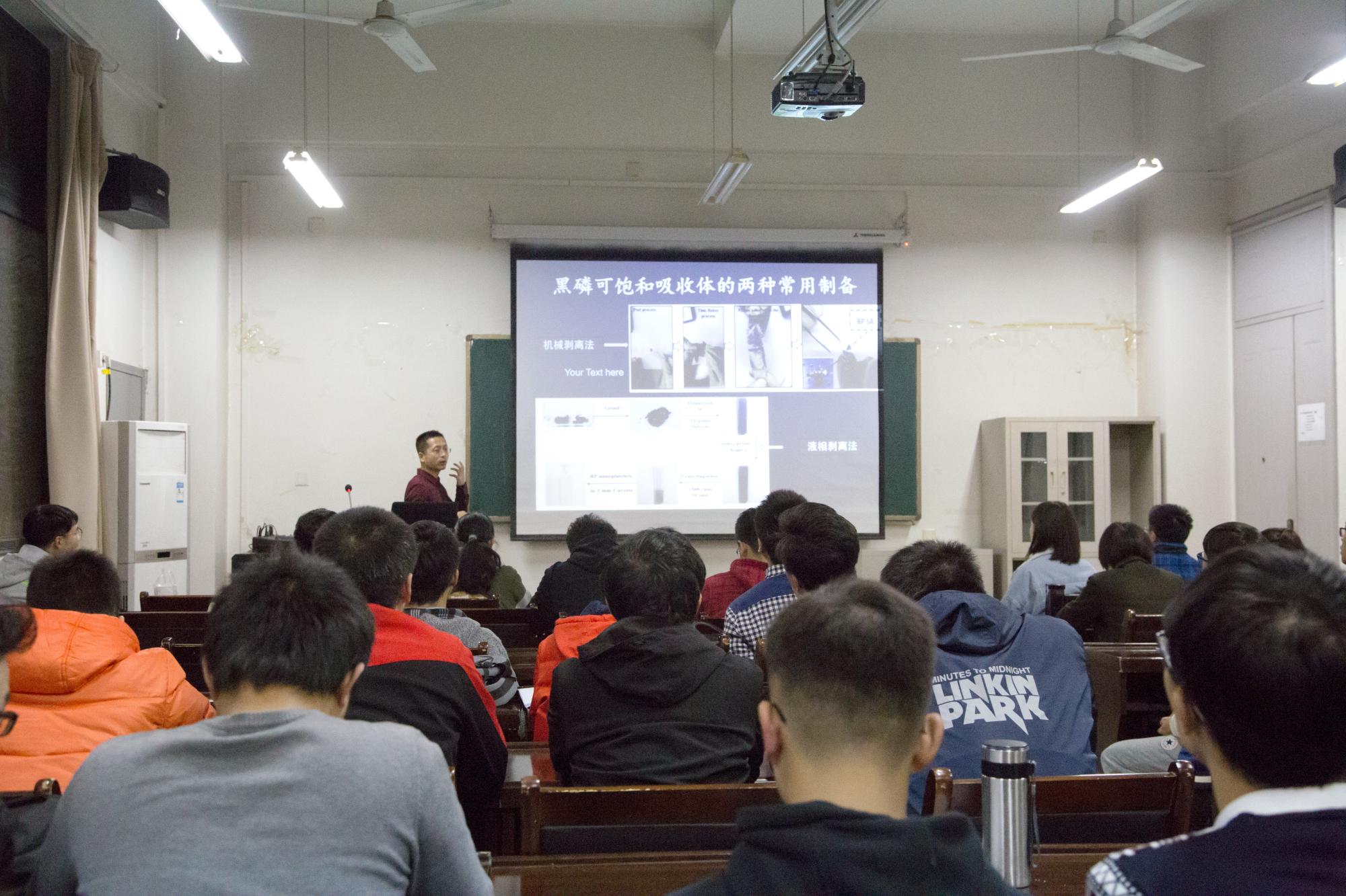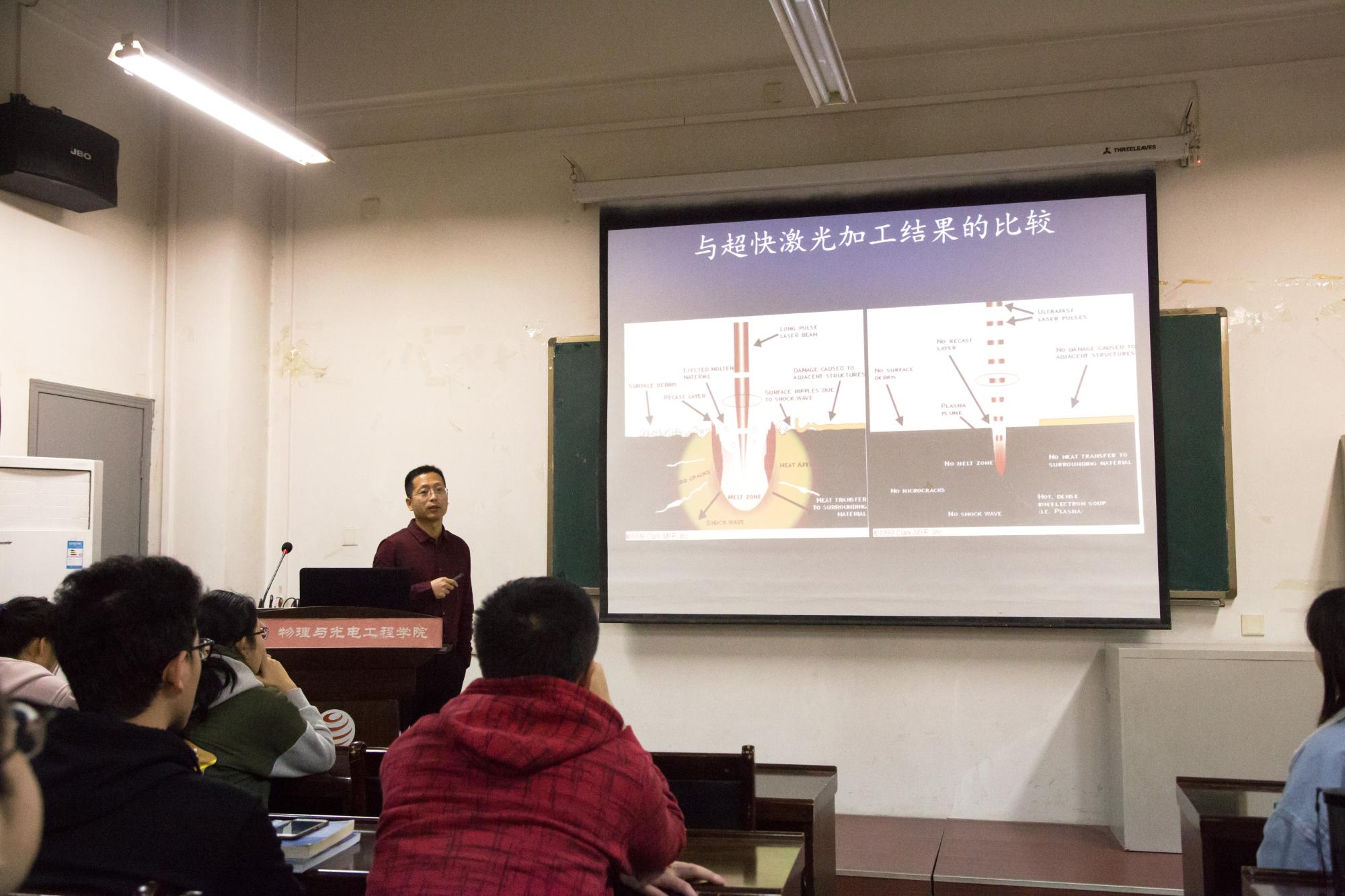 随后,王军利教授给同学们介绍了超快光纤激光与超快微纳制造。讲解中王教授讲到超快激光和我们的日常生活密切相关,在光元件制造和信息储存、冷焊接、高爆炸药切割、波导材料制造等方面都有广泛应用。在信息传输方面,王教授介绍了超快光纤激光技术,其易于集成、传输效率高、维护简单等明显特征,在2D材料制作和拓扑绝缘体上有重要运用。同学们不禁流露出对高新科技的赞叹之情和对未来的无限憧憬。