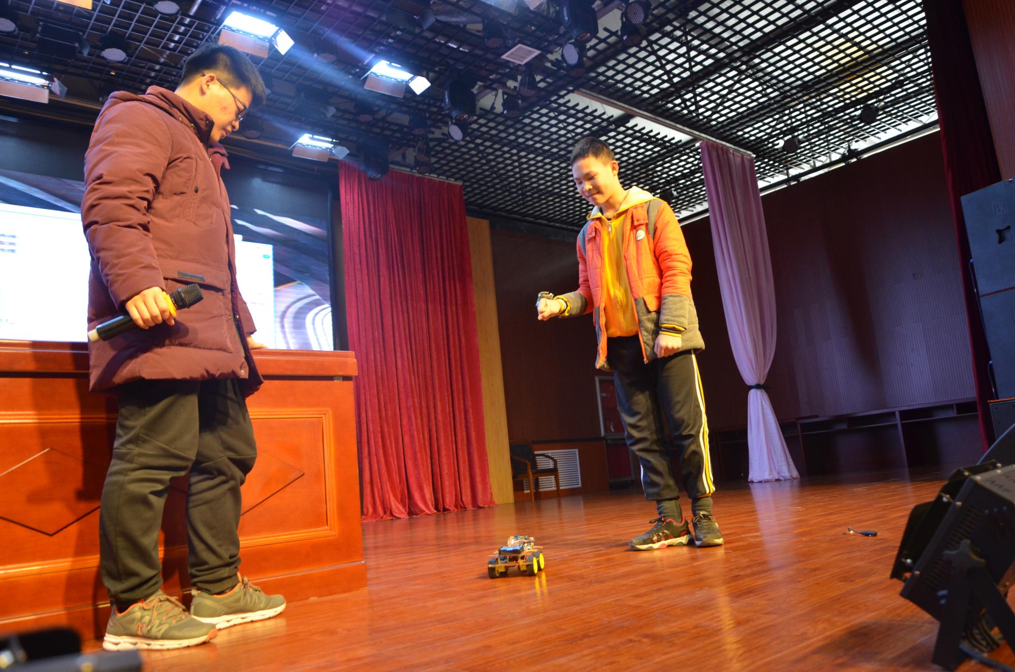 与此同时,学院的5位大学生代表还为城南学校的初中阶段的800余名同学们带来了一场题为“精彩的大学生活”的励志分享会。他们通过图片、视频,讲述了大学阶段丰富多彩的学习、生活,并结合自己初高中的经历以及教育教学环境分析,让同学们了解到学习的重要性,鼓励同学不断追求更高的平台,提高自己的视野,永远对学习保持求知若渴态度。在展示西电学生自己的科创作品时,城南学校的同学们争先恐后上台体验互动,表现出了极大的兴趣和热情,表示要努力学习,将来争做科技人才。