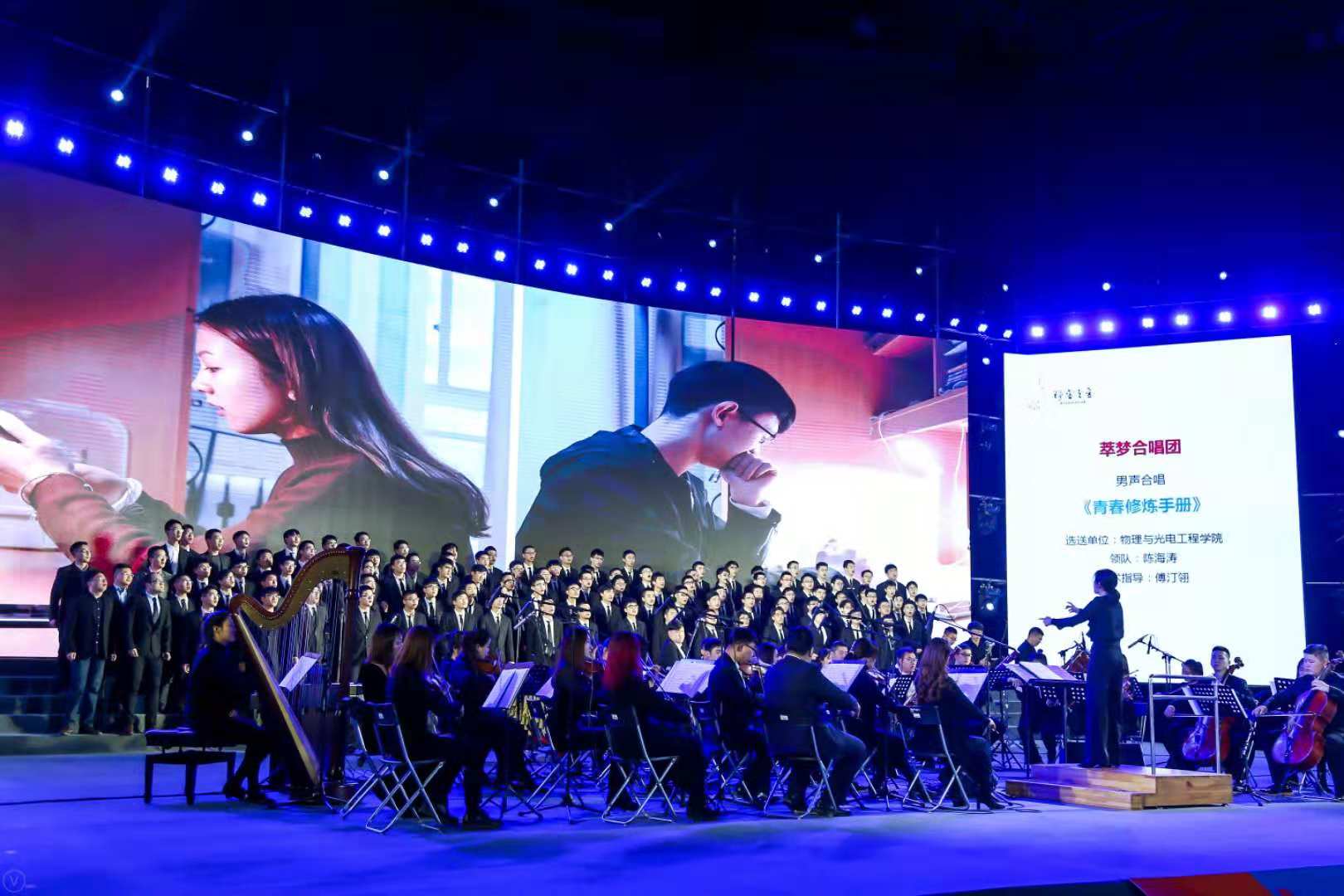 该活动旨在“用高雅的艺术引导人,用完美的艺术塑造人”,激发广大青年学生争做“有理想,有本领,有担当”西电人的热情和热爱学校、热爱集体、热爱艺术的情怀。萃梦合唱团选择演唱的《青春修炼手册》就是一首富有新时代昂扬气息的歌曲,合唱形式是纯男声合唱,分为男高音1、男高音2、男低音1、男低音2共四个声部。现场演唱时,合唱团成员随歌声活跃律动,配以大小提琴乐团悠扬伴奏,男高音嘹亮有力,男低音雄浑厚重,将歌曲中青春活力演绎的淋漓尽致,不仅唱出了青春的朝气蓬勃,更在各式精心设计的连环叠唱中彰显了恢弘大气,得到了台下评委的好评和观众的热烈反响,观众们纷纷打开手机灯光随歌声跃动,在一片灯海中为合唱团的演绎欢呼,将现场气氛推向高潮。