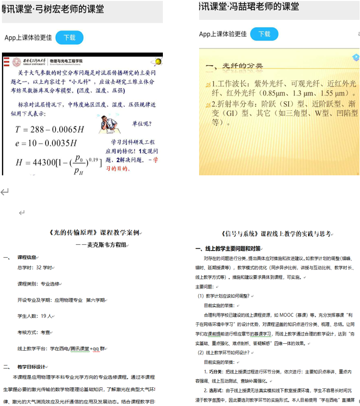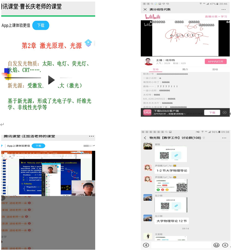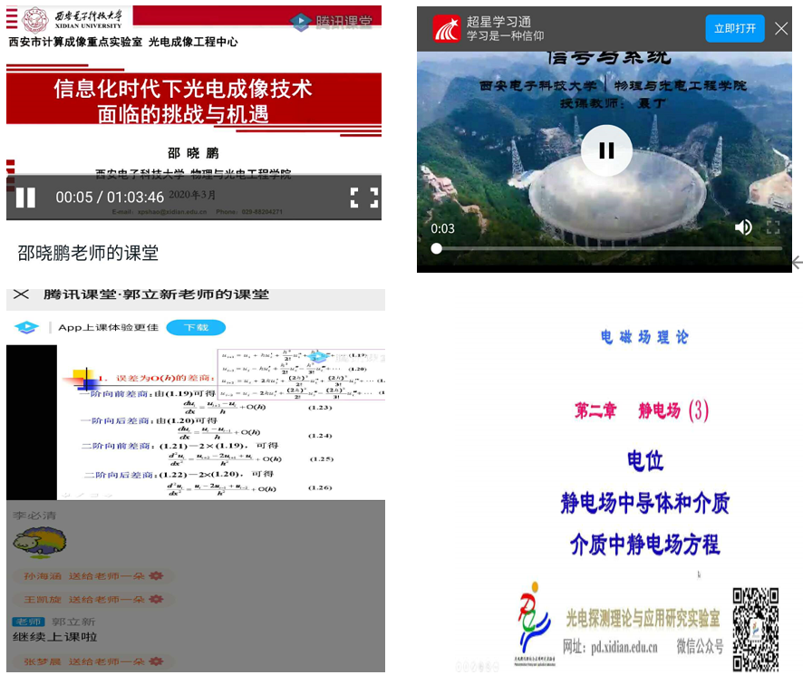 广大教师运用“雨课堂”“学在西电”“腾讯课堂”等各类平台,通过网上直播、PPT+语音、录播+答疑等方式,积极探索线上教学形式,开展多元化的课程教学及学业辅导工作,确保教学工作正常开展。很多老师结合网上教学特点和当代大学生特点,积极开展学生互动和随堂练习。针对部分时段网络平台登录难等问题,不少老师特别是老教师提前1-2个小时做好准备工作,受到学生的好评。