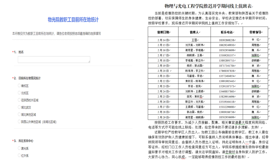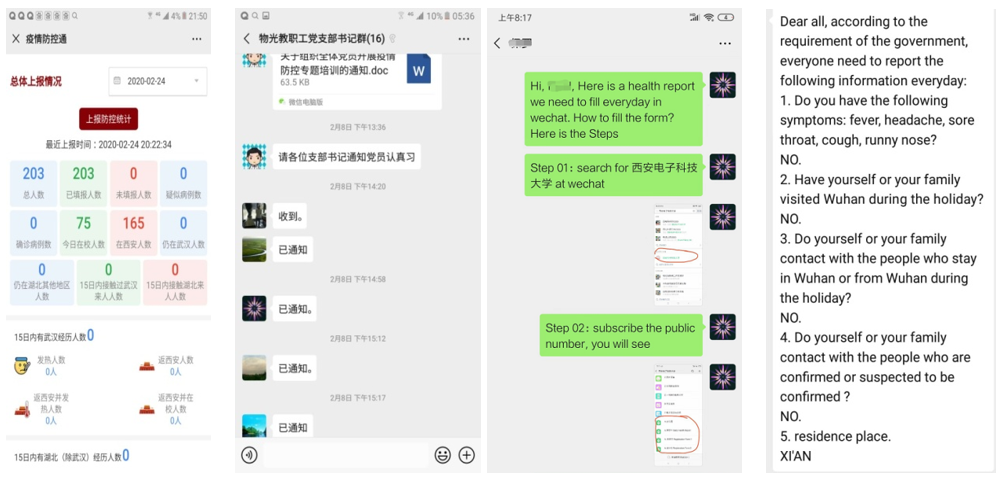为切实保障师生生命安全和身体健康,学院建立起“院办主任+党支部书记(副书记)”疫情防控信息报送队伍。在院领导指挥下,院办牵头协调,各教职工党支部充分发挥战斗堡垒作用,严格执行学校“疫情通”每日填报制度,摸排全院教职工出行动态和身体状况,认真执行重大突发信息报送制度,每日坚持汇总、分析、上报,确保信息畅通、响应及时、处置迅速、措施妥当。通过微信群、QQ群、电子邮件等多种方式及时宣传中央、上级、学校有关部署要求和防疫知识、心理健康知识,及时掌握一手信息、资料,为决策提供依据。同时,积极与在国内的学院外籍教师进行联络沟通,确保其做好防护工作。