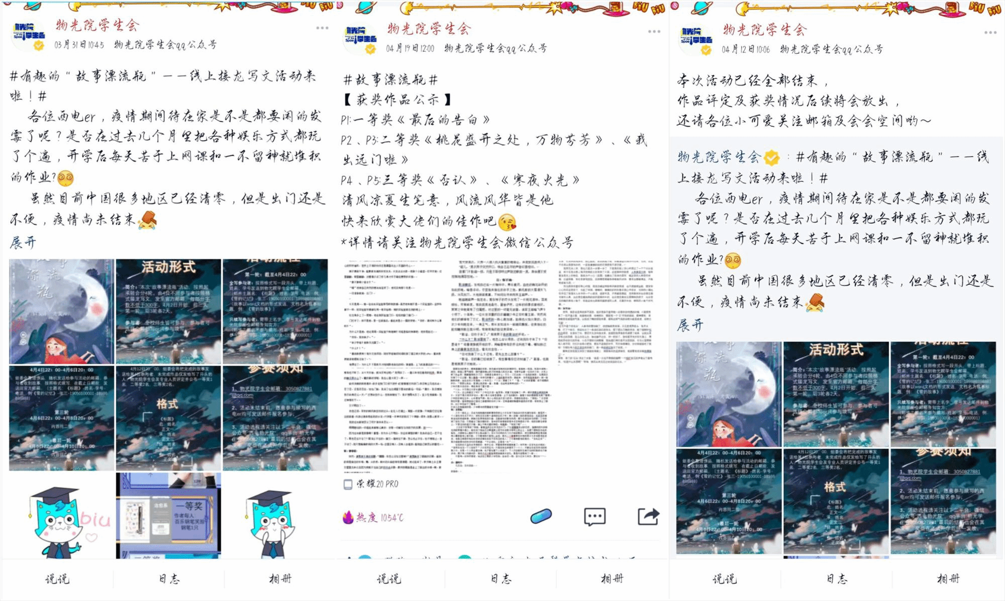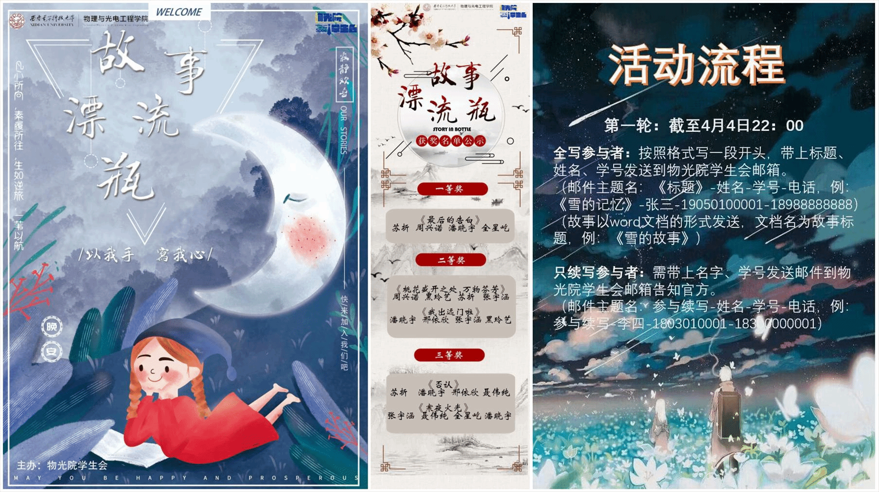 “故事漂流瓶”线上活动不限定主题,活动伊始就吸引来了广大同学的关注,同学们踊跃参与线上创作、大展笔墨,用丰富的想象和细腻的文笔撰写出一个个令人寻味的故事开端,在随后的两轮中,通过匿名传递的方式,在所有选手间随机流转,同学们用寥寥数字描绘出具体而生动的画面,在呼应前文的基础上,为下文的行进埋下伏笔,用文字记录自己的故事,让同一颗“种子”成长为不同的“大树”,最精彩的部分莫过于结尾对故事悬念的揭晓,在四位随机组合的同学不同思维的碰撞下,创作出了一部又一部动人心弦的作品,最终根据好评度对作品进行排序打分。经过层层筛选,作品《最后的告白》获得一等奖,《桃花盛开之处,万物芬芳》和《我出远门啦》获得二等奖,《否认》和《寒夜火光》获得三等奖。