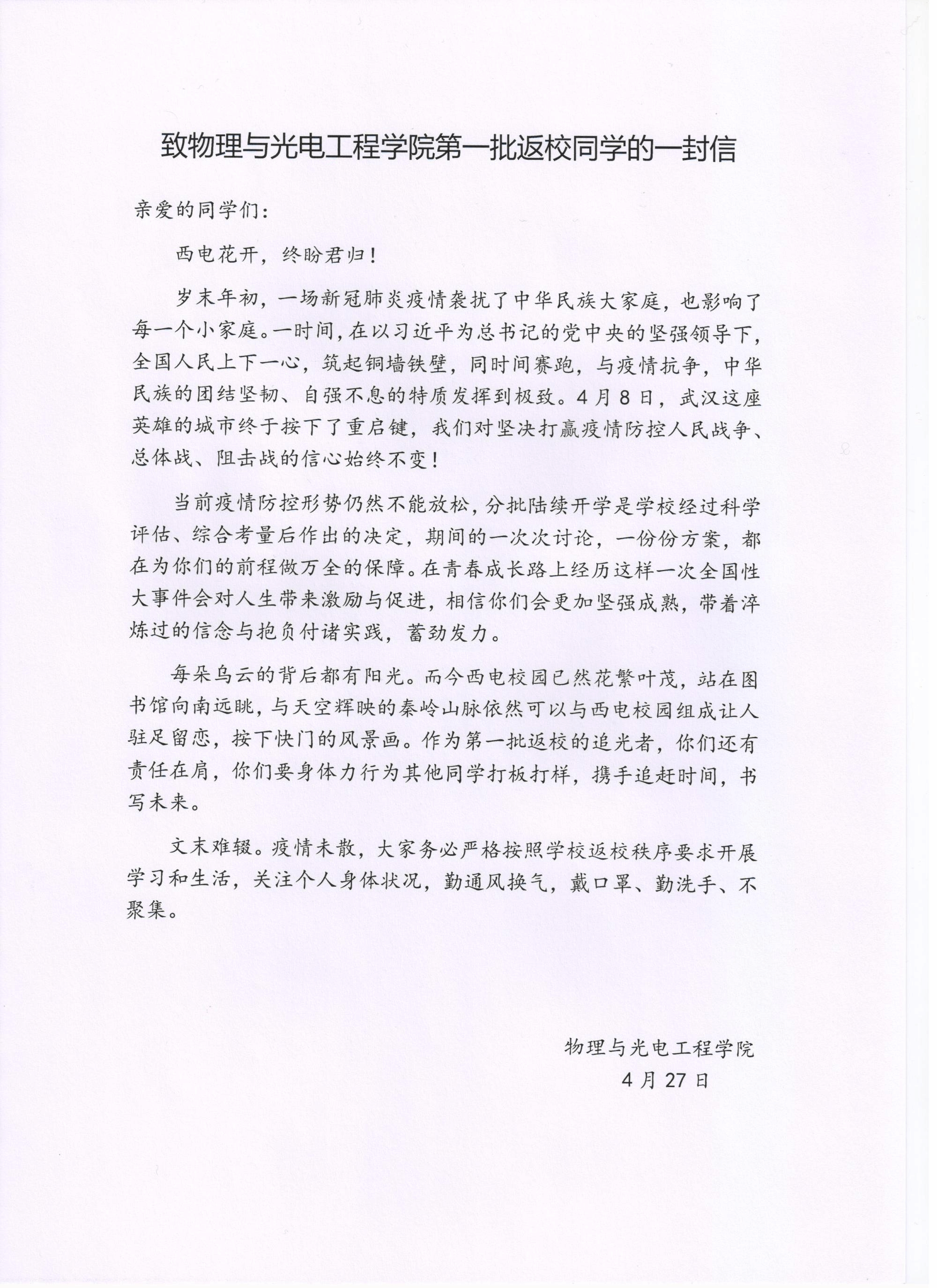“每朵乌云的背后都有阳光。而今西电校园已然花繁叶茂,站在图书馆向南远眺,与天空辉映的秦岭山脉依然可以与西电校园组成让人驻足留恋,按下快门的风景画。作为第一批返校的追光者,你们还有责任在肩,你们要身体力行为其他同学打板打样,携手追赶时间,书写未来。”电子科学与技术专业刘玉杰在读到这里时深深地感受到学院给返校学生给予的关爱和支持。