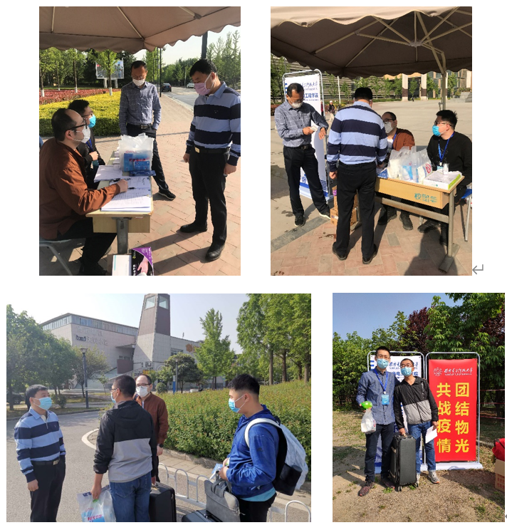 按照学院返校方案,学院分别于校东门和北门设置两个返校接待点。27日一大早,学院党委书记独国社、执行院长邵晓鹏、党委副书记林波便来到校东门学院接待点查看相关物资准备和接待情况。独国社向接待辅导员询问了当日要返校的学生的总体情况并就学生返校后的具体安排管理进行了了解。邵晓鹏查看了学院给返校学生准备的物资,现场测验了红外测温仪的测温效果。随后他们又来到校北门的接待点,正巧碰到一位从湖南省张家界市来的电子科学与技术专业学生龚辉,独国社向他详细询问了返程路途中的情况,并告诉他返校后在学校遇到任何问题及时跟辅导员联系,学院会尽力安排好大家的衣食住行,为大家返校后的生活和学习提供坚实保障。