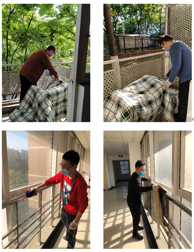 26日下午,为让学院学生返校后能有一个温暖的家,赶着炙热的骄阳,学院辅导员深入竹园三号公寓楼第一批返校学生的宿舍,为学生们暖心晒被,同时做好宿舍的消杀等准备工作。一时间,阳台上、栏杆上、晾衣架上都摆满了学生们五颜六色的被褥。经过两个小时的晾晒,暖暖活活的被褥又被辅导员们收起,整整齐齐的叠放在学生的高架床上。“给返校学生晒被褥是学院安排的一项暖心工程,我们就是想让学生在离别学校一百多天返回学校后能第一时间感受到学院给予的温暖!”学院辅导员刘昕玮在收拾完学生被褥后说道。