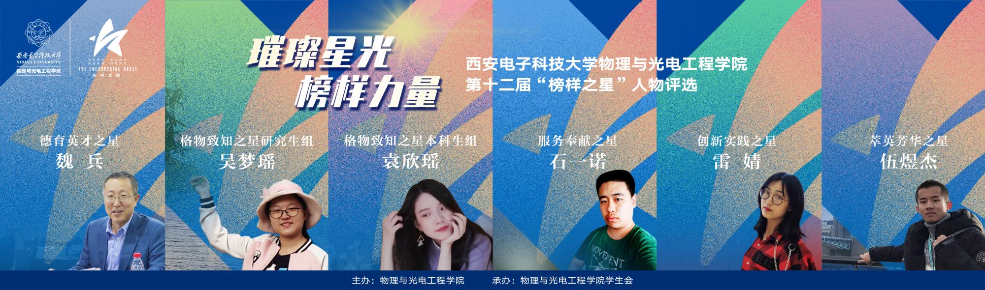经过宣传报名、资料审核、事迹巡展、网络投票、正选提名等为期三个多月的层层选拔,最终评选出:以身“格物”、以心“致知”,求学不止,积极求索,潜心科研的“格物致知之星”研究生吴梦瑶、本科生袁欣瑶;以德塑人、以学识育人,助力西电学子成长成才的“德育英才之星”魏兵教授;具有奉献意识、强责任心,积极投身校院和社会志愿服务工作的“服务奉献之星”石一诺;善于组织策划或积极参加各类文体活动,挥洒汗水书写青春风采的“萃英芳华之星”伍煜杰;刻苦学习,积极进取,坚持创新追求卓越、实践出真知的“创新实践之星”雷婧,以及在各方面表现突出的众多优秀本科生、研究生和专任教师。