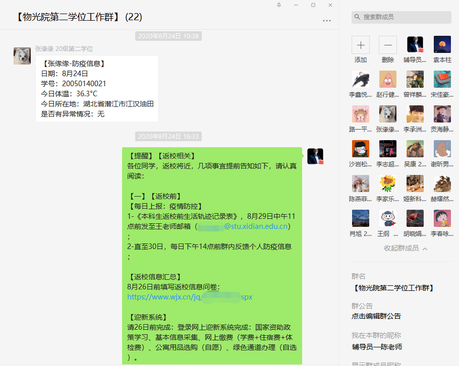 在录取结果公布后,学院辅导员第一时间与学生取得联系,介绍校院基本情况,掌握学生当前学习生活环境和身体状况;建立线上沟通微信群,及时将学校第二学士学位相关讯息通知到位,每日记录学生疫情防控信息,动态更新返校前活动轨迹,逐一前往新生所在宿舍,查看床铺准备情况;来校前,辅导员通过腾讯会议进行线上点名,将报到注意事项、疫情防控要求、新生入学体检等相关事宜进行说明,并就学生关于来校交通、公寓入住、饮食采购等问题进行解答。