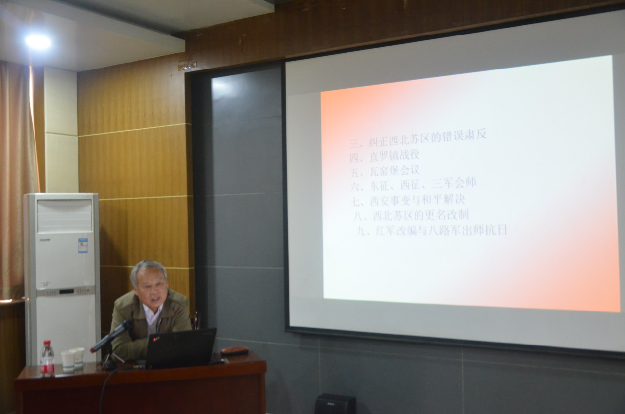 报告中,姚文琦教授谈到,西北根据地是在陕甘边根据地和陕北根据地的基础上,统一后形成的革命根据地,是中国北方武装斗争的一面旗帜。回顾历史,他从发展沿革、组织变迁、革命人物、关键战斗、重要会议等多个方面细致讲述了自1927年至1937年土地革命战争时期陕甘边根据地和陕北根据地的建立历程。通过讲述,生动还原了西北红军在清涧起义、渭华起义、三原县起义、旬邑县起义以及数次反“围剿”中的激烈战斗场面,细致剖析了陈家坡会议、包家寨会议、阎家洼子会议对革命发展进程的重要作用,结合史实讲述了刘志丹、谢子长等革命先烈在艰苦卓绝的斗争中体现出的纯洁革命理想、坚定革命信念。他强调,西北根据地是土地革命战争时期全国唯一保留完整的一个革命根据地,是各路红军长征的落脚点也是八路军抗日的出发点,在长期革命实践中,西北根据地为中国革命培养出了一批著名的领袖人物,在西北根据地中孕育出的延安精神、照金精神、南梁精神与其他革命精神融合在一起,让革命的星星之火,在中国大地上熊熊燃烧。