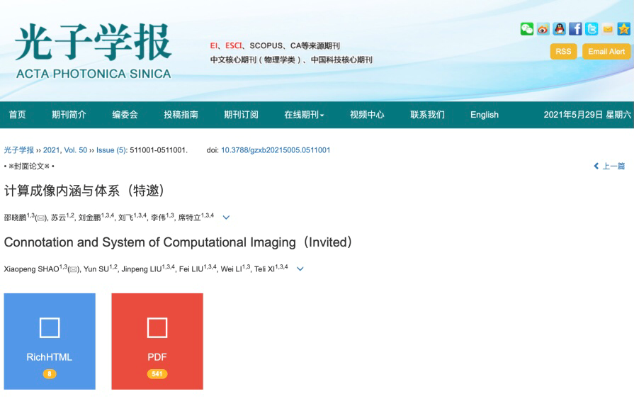 邵晓鹏教授课题组受邀在《光子学报》2021年第5期发表了题为“计算成像内涵与体系”的封面文章。《光子学报》是中国科学院中国光学学会主办、科学出版社出版的学术月刊,该刊曾多次获得中国国际影响力优秀学术期刊、陕西省科技期刊精品期刊等称号。目前已被EI、ESCI、SA/INSPE、CSCOPUS、CA等数据库检索收录,也是中文核心、中国科技核心及CSCD来源期刊。