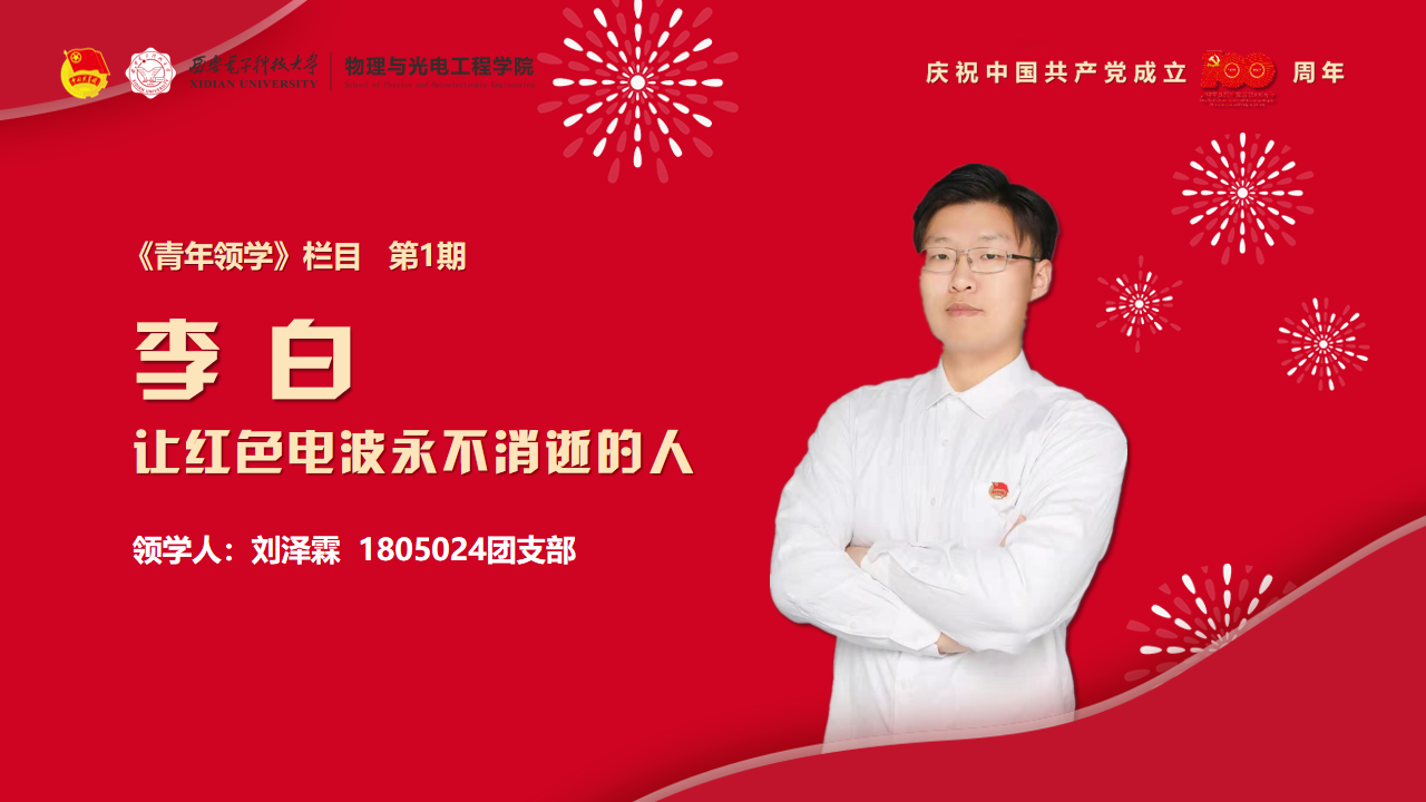 学院学生党员刘泽霖将党史学习教育同爱校荣校教育结合起来,他领学的故事是《李白——让红色电波永不消逝的人》,作为第一期《青年领学》栏目为大家起了好头。故事讲述了在江西瑞金中央军委无线电学校(即现西安电子科技大学前身)第二期电讯班学习无线电技术的李白烈士,从事党的秘密电台工作,同敌人英勇斗智的英雄故事。他谈到,“李白烈士是革命先辈,也是杰出校友,更是西电人的精神标杆。他伟大的革命斗争精神将同这永不消逝的红色电波一起,永远留存于亿万中国人的心中。作为当代大学生应当学党史、强信念、跟党走,赓续红色血脉、勇担时代使命,将个人理想融入祖国建设和社会发展,为全面建设社会主义现代化国家、实现中华民族伟大复兴的中国梦贡献青春力量。”