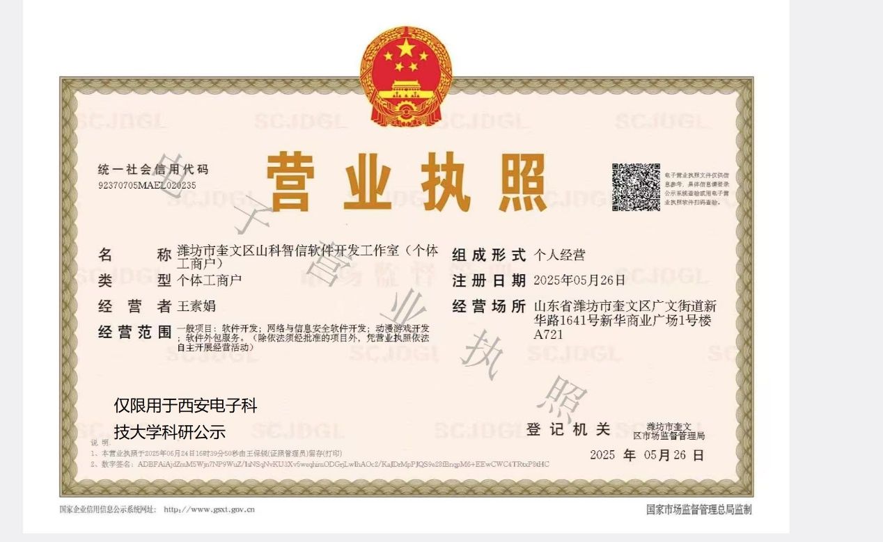 按照《西安电子科技大学科研协作项目管理办法(试行)》文件规定,为加强学校科研协作项目的管理,确保我方承接的智能样本数据仿真系统项目研发的顺利进行。我校项目负责人孙浩将与潍坊市奎文区山科智信软件开发工作室(个体工商户)开展科研合作,现将合作相关事项公示如下: