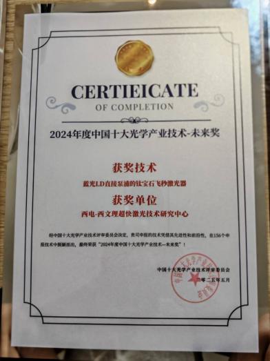 朱江峰教授团队与西安文理学院刘寒博士团队联合申报的“蓝光LD直接泵浦的钛宝石飞秒激光器”技术凭借其创新性、技术突破性及产业化潜力,成功获评2024年度中国十大光学产业技术-未来奖。