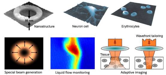 定量相位显微(Quantitative Phase Microscopy, QPM)技术,通过将相位成像和显微技术相结合,不仅可以对透明样品进行高衬度成像,还可以对样品的三维形貌、透明物体厚度或折射率分布进行定量测量。然而,受到光学衍射极限的限制,其空间分辨率一般只有200-300nm,不能满足研究观测样品微细结构的需要。为此,我们首次将结构照明(条纹、散斑)和基于光学干涉的数字全息显微相结合,将相位显微的空间分辨率提高了一倍;提出了基于调制照明的单光束相位显微技术,在无需参考光的前提下实现了对透明样品的超分辨成像。此外,我们还采用4p照明来提高相位显微技术的轴向分辨率,并实现对动态样品的自动调焦。这方面的工作报道在Opt. Letts、Sci, Rep., J.opt上,文章发表后也曾被选为“Spotlight of OSA”,“IOP-Select”,“Top-10 download”。