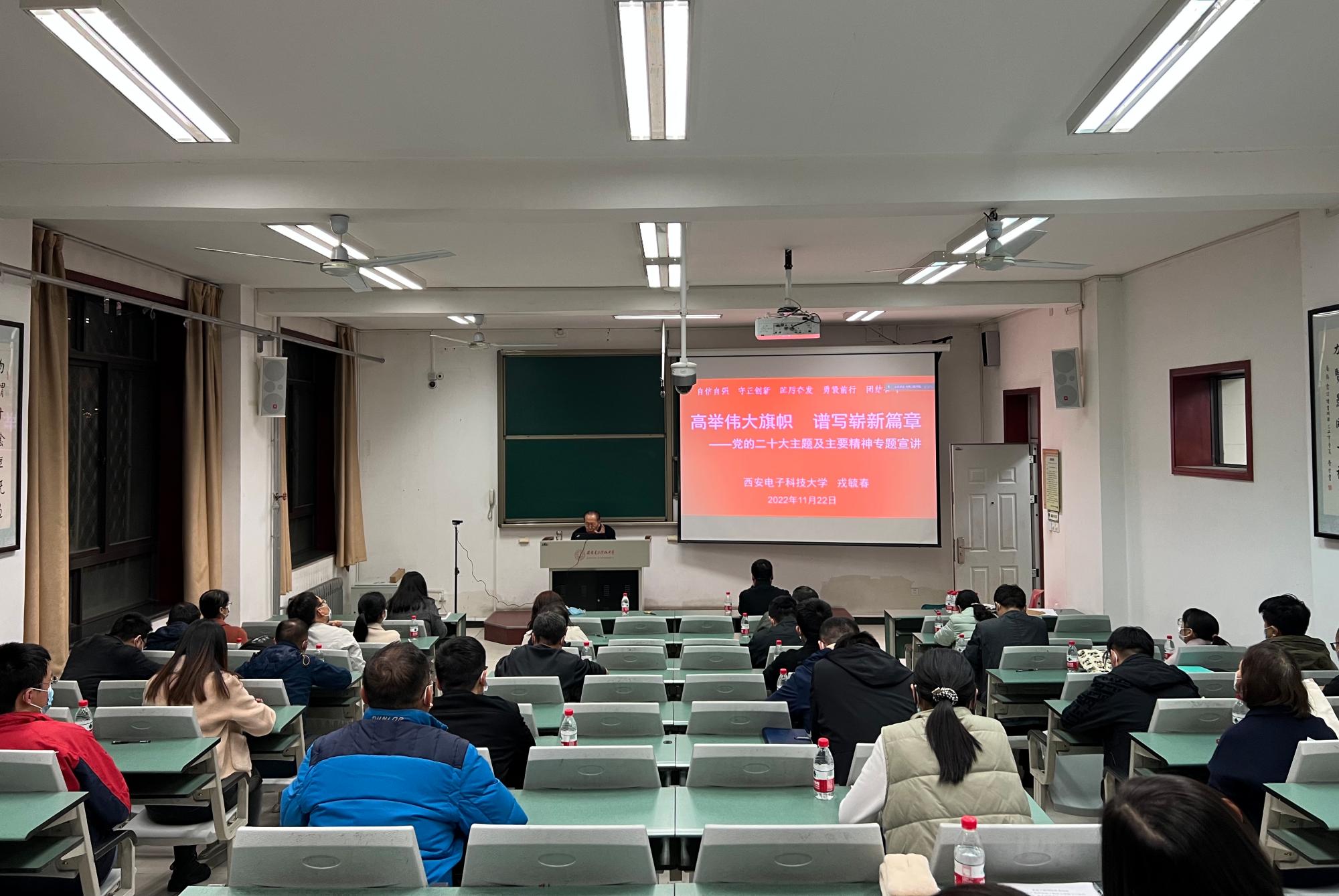 11月22日晚,“学习宣传贯彻党的二十大精神宣讲团”成员戎毓春教授为全院教职工党员、学生党员代表做了题为《高举伟大旗帜谱写崭新篇章》的专题宣讲。他围绕当前党和国家形势,立足高校发展实际,从新时代十年的伟大变革、新时代新征程党的使命任务等七个方面,系统阐释了党的二十大主题及主要精神,激励广大师生深入学习宣传贯彻党的二十大精神,深刻理解科教兴国、人才强国、创新驱动发展战略,真正将党的二十大精神内化于心、外化于行,转化为推动学院事业高质量发展的思路举措。全院师生通过本场报告更加深刻认识到党的二十大的重大意义,深刻领会到“两个确立”的决定性意义,进一步增强“四个意识”、坚定“四个自信”、做到“两个维护”,为落实高校立德树人根本任务打下坚实的基础。