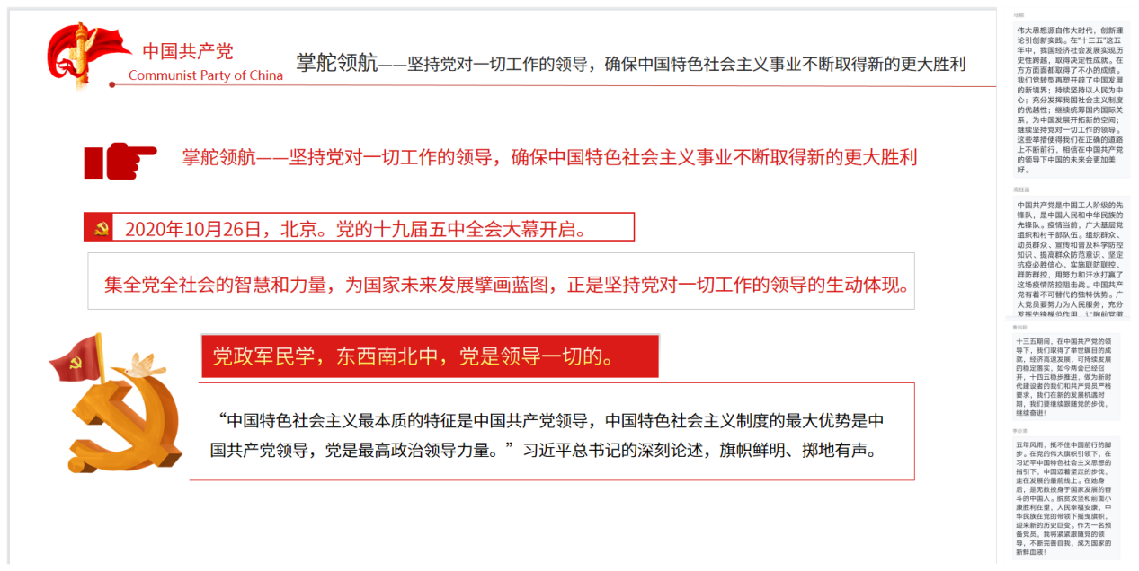 党小组学生党员们纷纷表示,通过这次的线上专题学习,更加坚定了理想信念,第一个百年奋斗目标实现胜利,第二个百年奋斗征程即将开启,站在历史交汇点上,展望“十四五”光明前景,瞻望2035年远景目标,在伟大旗帜指引下,我们豪情满怀。