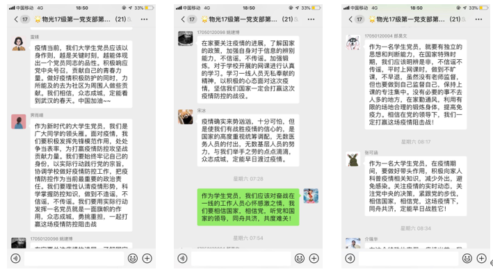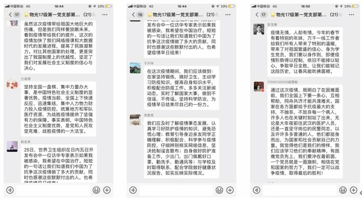 随后,党小组成员轮流发言。20名成员分别从自身角度进行了发言。大家根据在疫情期间对战“疫”这一事件的关注,从自己身边的小事讲述了全国上下对待疫情的积极态度。并对疫情期间的奋战在一线的逆行者们,党领导人,背后默默奉献的清洁工人等表达了感激之情。其次是所做所行,大家分享了在疫情期间如何做到不信谣不传遥,并对一些不实言论进行了辟谣。还有些组员讲述了自己如何向身边的亲人朋友普及有关疫情的方方面面。大家在发言的最后都根据自己对疫情的了解发表了感悟。相信在党中央的正确领导,自上而下党员同志的积极响应下,战“疫”一定会胜利。以及作为大学生党员的我们如何从自身做起,为打赢这场战“疫”贡献自己的力量。