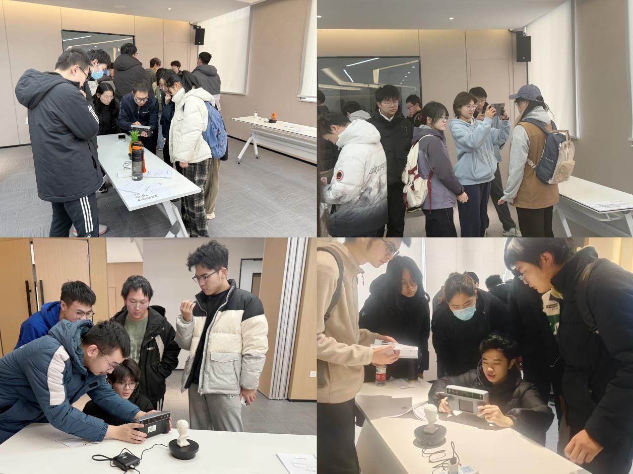 在互动体验环节,同学们分组操作体验了知象光电自主研发的手持式3D扫描仪。大家操作设备,对实物进行三维建模,亲眼见证高精度三维数据快速生成的过程。这种“从理论到实物、从算法到产品”的体验,让同学们对光电系统的集成与应用有了更为具体和深刻的理解,也进一步激发了大家对专业学习的兴趣与热情。
