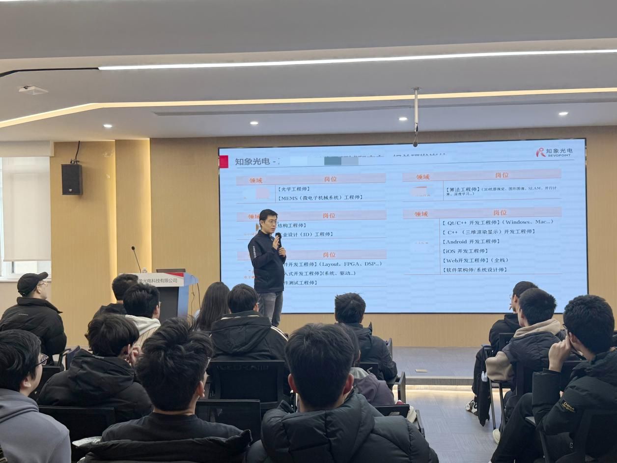 在交流环节中,知象光电人才发展负责人晏瑜介绍了公司的发展历程、技术优势及行业地位。她指出,光电产业作为高新技术领域的重要组成部分,正迎来快速发展期,为青年人才提供了广阔的就业前景和多元的职业路径。她特别强调随着行业技术门槛的不断提升,攻读研究生、深化专业积累将成为提升核心竞争力的重要途径,提醒同学们提早规划、持续学习,为未来职业发展筑牢基础。